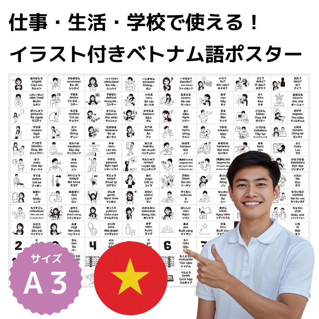 一般的な仕事で使われる頻度の高い言葉100語の、ベトナム語と日本語とイラストをまとめたA3サイズ(297mm×420mm)の合成紙ポスターです。外国人の方との交流、日本語/ベトナム語学習の補足教材などにお使いください。
