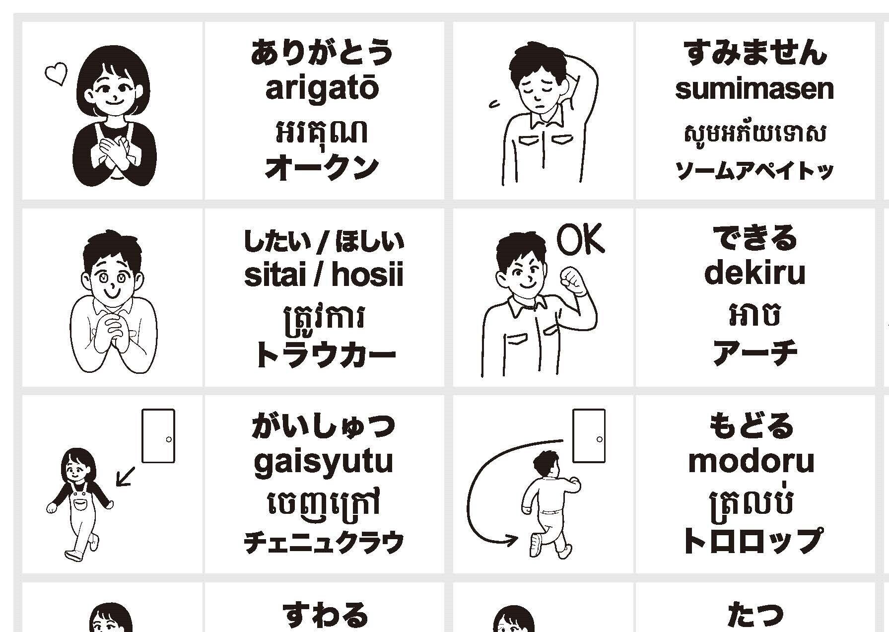 一般的な仕事で使われる頻度の高い言葉100語の、クメール語(カンボジアの母国語)と日本語とイラストをまとめたA2サイズ(420mm×594mm)の合成紙ポスターです。外国人の方との交流、日本語/クメール語学習の補足教材などにお使いください。